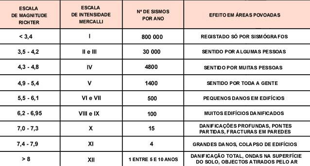 A escala Richter é um sistema criado, a cerca de 70 anos para medir os movimentos sísmicos. Charles Richter desenvolveu o sistema que mede a potência de um tremor em um determinado lugar. A escala Richter é pontuada de um a nove. Cada grau corresponde a ondas dez vezes mais “fortes”, a uma potência 30 vezes superior. Assim, por exemplo, um terremoto de grau nove na escala Richter é 900 vezes mais potente que um tremor de grau sete. Um terremoto de menos de 3,5 graus é apenas registrado pelos sismógrafos. Um entre 3,5 e 5,4 já pode produzir danos. Um entre 5,5 e 6 provoca danos menores em edifícios bem construídos, mas pode causar maiores danos em outros. Já um terremoto entre 6,1 e 6,9 na escala Richter pode ser devastador numa zona de 100 km. Um entre sete e 7,9 pode causar sérios danos numa grande superfície. Os terremotos acima de oito podem provocar grandes danos em regiões localizadas a várias centenas de quilômetros do epicentro.